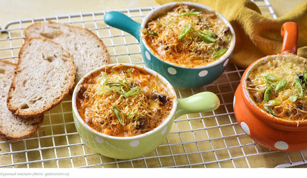 Куриный жюльен по этому рецепту готовится довольно нестандартно, но получается блюдо очень вкусным и нравится всем, кто его пробовал. Настоятельно рекомендуем проверить такой вариант на практике! В качестве основы жюльена используется сочная мякоть куриных бедрышек. Ну а грибы мы решили взять те, что круглый год продаются в любом магазине у дома — вешенки и шампиньоны. Сыр же можно взять любой, который вам нравится. Но именно твердый выдержанный обеспечит вкусу куриного жюльена насыщенные пикантные ноты.