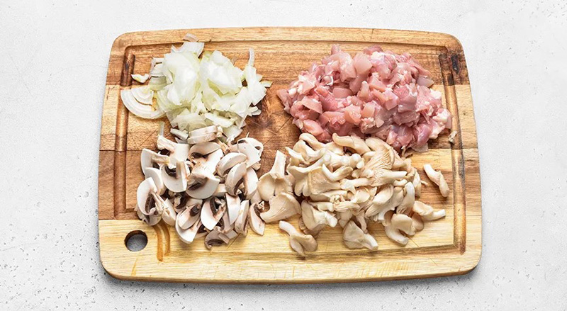 Подготовьте ингредиенты. Нарежьте соломкой очищенный репчатый лук. Вешенки, шампиньоны и мякоть куриных бедрышек нарежьте маленькими ломтиками произвольной формы.