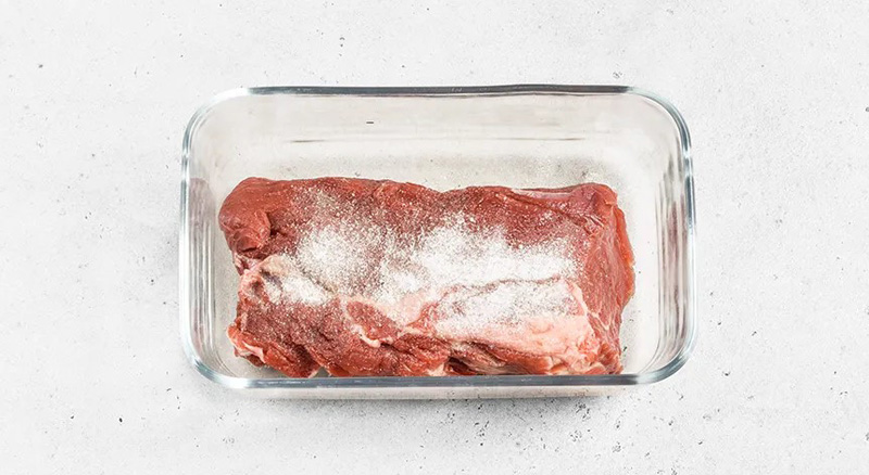 Бастурма из говядины в домашних условиях не подвергается никакой тепловой обработке, являясь, по сути, сыровяленым продуктом. Для безопасности ее следует готовить только с нитритной солью. На каждый килограмм мяса вам потребуется 28 г нитритной соли с содержанием нитрита натрия 0,5% — заранее рассчитайте и отмерьте на весах необходимое количество.