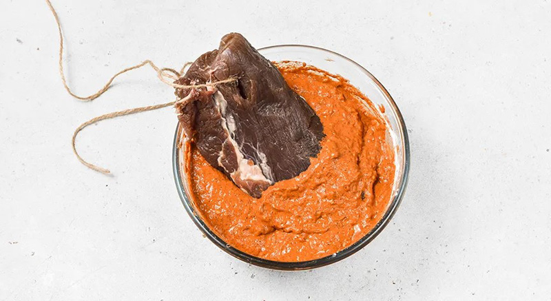 Дайте обмазке настояться хотя бы 15–20 минут — за это время она станет значительно гуще. С помощью острого ножа проколите просоленную говяжью вырезку с одного края. Вденьте в отверстие кулинарный шпагат, за который мясо можно будет подвесить.