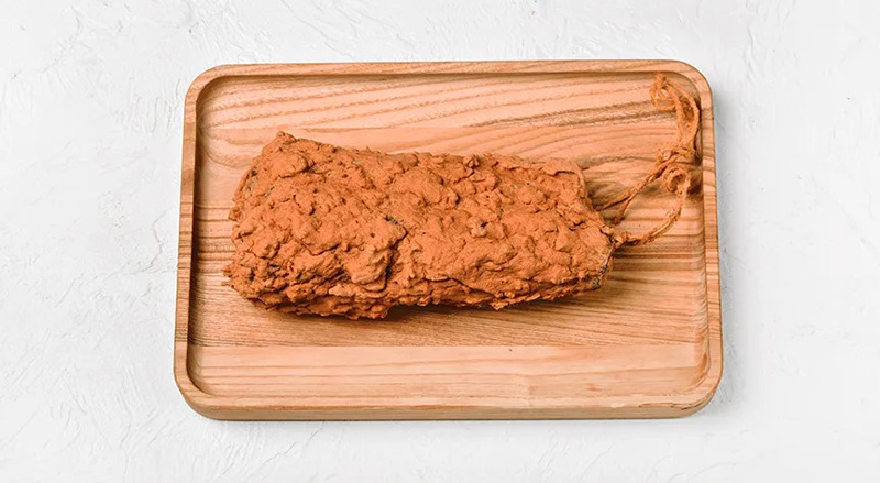 Смажьте говядину со всех сторон толстым слоем ароматной обмазки. Следите, чтобы не оставалось никаких пустот — мясо должно быть как в коконе. При этом у вас еще останется довольно много обмазки — так и должно быть. Переложите ее в герметично закрывающийся контейнер и уберите в холодильник.