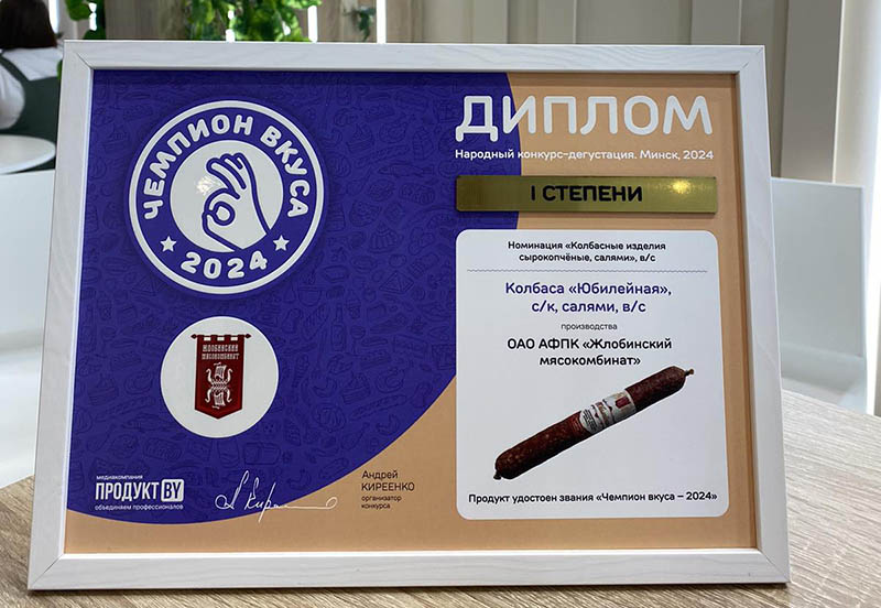 Дипломами I степени награждены следующие изделия жлобинского перерабатывающего предприятия: сальтисон «Домашний», «Стейк для гриля» и колбаса «Юбилейная» с/к, салями, в/с.