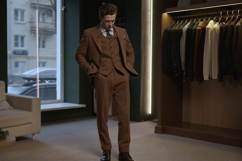 Выбираем табачно-рыжий оттенок твидового костюма-тройки. К нему подойдет сорочка в голубую полоску. Галстук — серый. Рыжий и серый — классическое сочетание, которое часто используют производители автомобилей в салонах. Рисунок на галстуке повторяет цвет костюма.