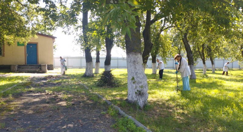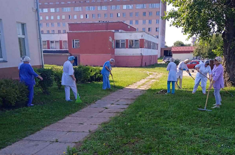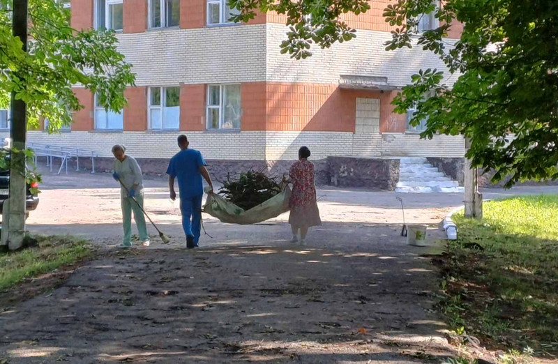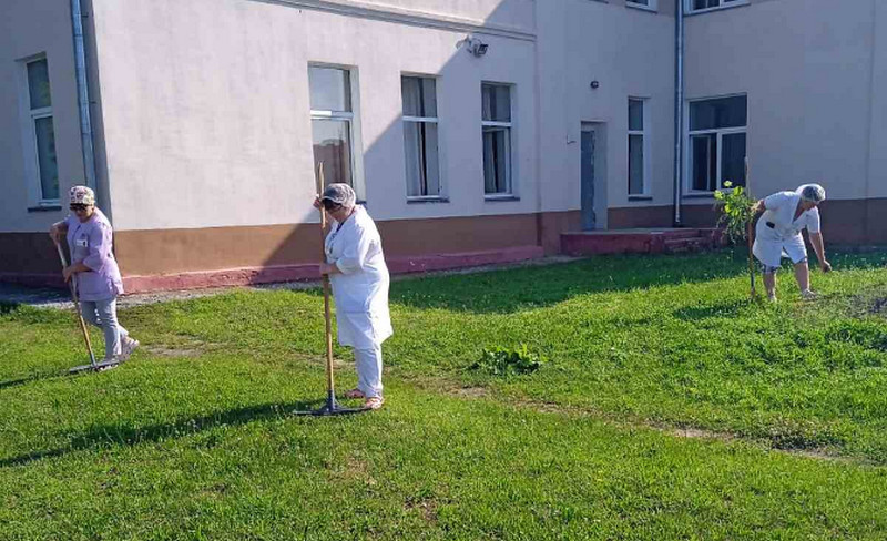 Территория больничного городка приводится в порядок силами самих медработников. Вместе с персоналом трудится главный врач, депутат областного Совета депутатов Евгений Топчий со своим заместителем, депутатом районного Совета депутатов Виталием Авдеевым.