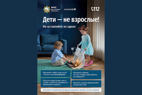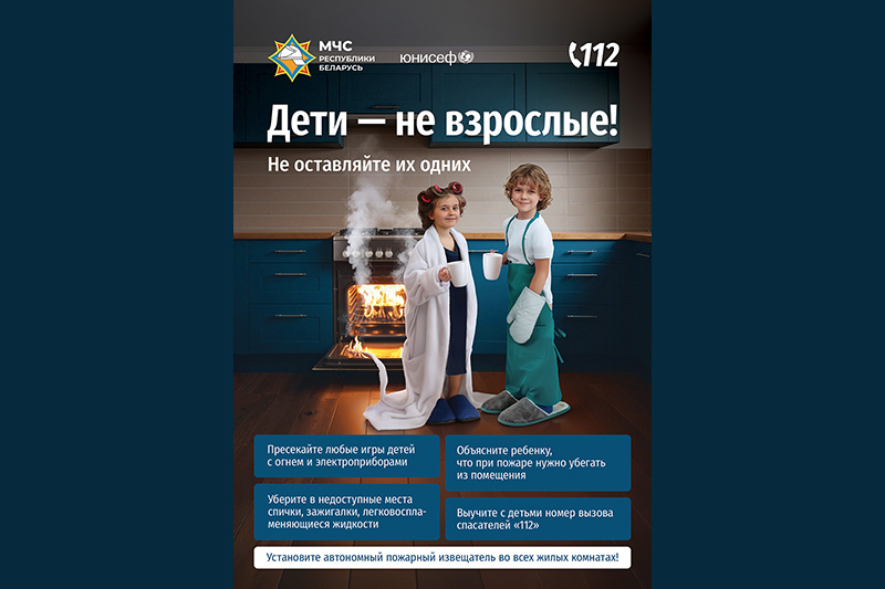 на пожарах и водоёмах, работниками Научно-исследовательского института пожарной безопасности и проблем чрезвычайных ситуаций МЧС Беларуси при поддержке Представительства Детского Фонда ООН (ЮНИСЕФ) в Республике Беларусь разработана новая информационная кампания «Дети – не взрослые! Не оставляйте их одних!». Она будет проводиться на протяжении всего 2026 года и будет направлена на предупреждение гибели детей на пожарах и водоёмах, на повышение уровня осведомленности родителей о потенциальных опасностях для детей.