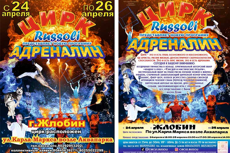 С 24 по 26 апреля жители и гости Жлобина смогут посетить гастроли цирка «Руссоли». На первое представление действует АКЦИЯ «2+1»: при покупке двух билетов третий предоставляется бесплатно.