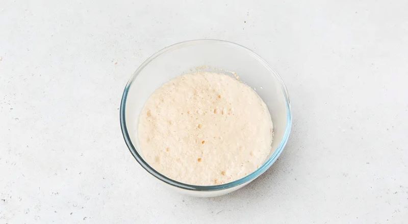 Для теста приготовьте опару. Растворите сахар в теплой воде, добавьте дрожжи и 2–3 столовых ложки муки из общего количества. Перемешайте массу до однородности и дайте дрожжам активироваться в течение 15 минут.
