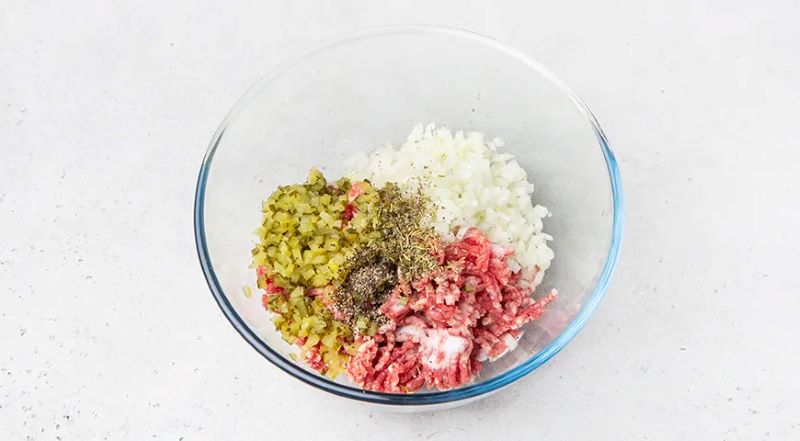 Пока тесто подходит, приготовьте начинку для белорусских смаженок. Мелко нарежьте маринованный огурчик и репчатый лук, смешайте с мясным фаршем. Добавьте ароматных сухих трав, приправьте свежемолотым черным перцем и солью по вкусу.