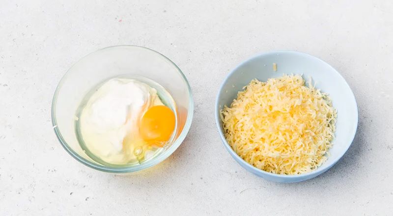 Приготовьте заливку для смаженок. Вымойте и оботрите яйцо. Разбейте его в чашку, смешайте со сметаной до однородности. Слегка посолите. Сыр натрите на крупной терке.