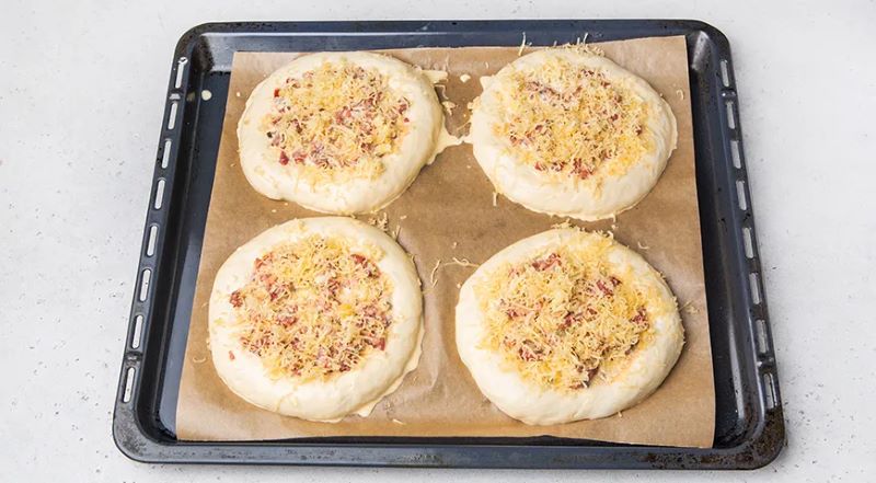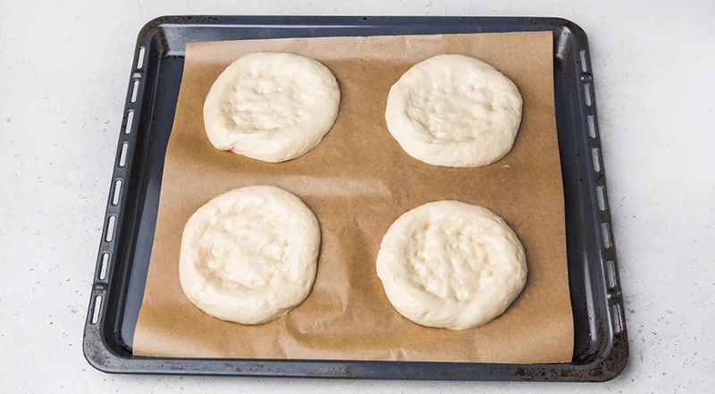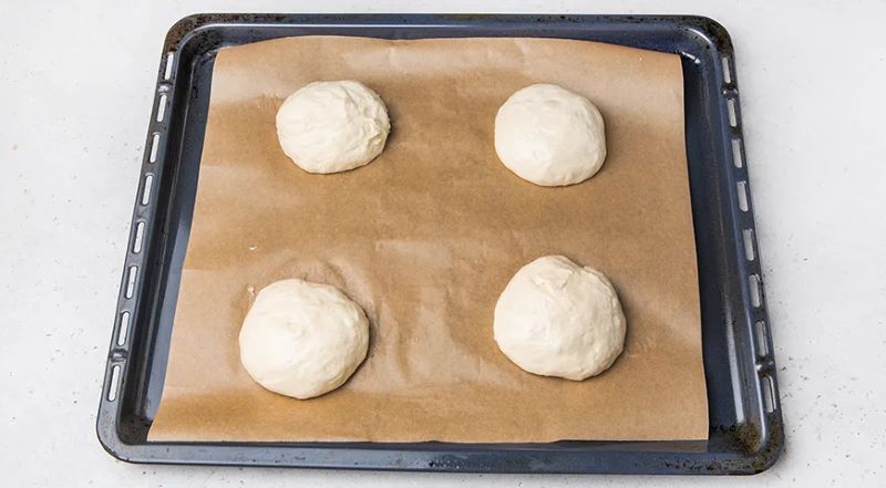 Разогрейте духовку до 200°С. Застелите противень пергаментной бумагой или силиконовым ковриком. Работайте с тестом, смазывая руки подсолнечным маслом. Обомните его и разделите на 4 части, скатайте шарики и разложите их на противне.