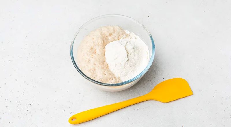 Когда опара будет готова – пойдут пузырьки, и вы убедитесь в «работоспособности» дрожжей, добавьте соль и порциями всыпьте просеянную муку, перемешивая тесто лопаточкой.