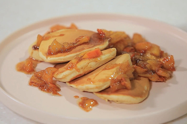 Нарежьте хурму крупными дольками. На разогретой сковороде растопите 40 г сливочного масла, добавьте полторы столовые ложки тростникового сахара. Выложите хурму и обжаривайте ее две минуты. Затем добавьте немного корицы и две чайные ложки меда и обжаривайте еще две минуты. Подавайте панкейки вместе с хурмой.