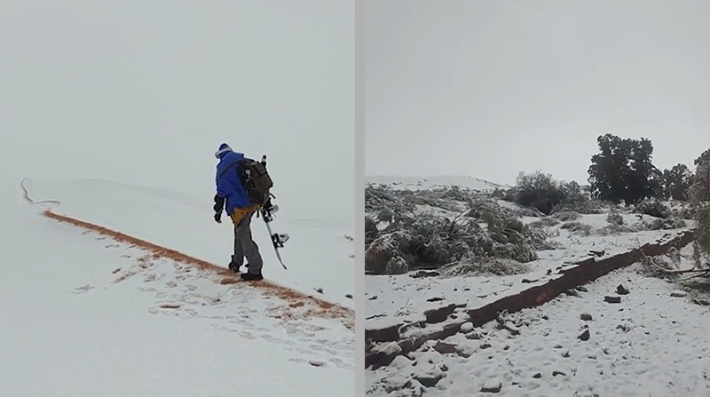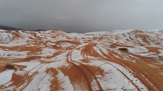 Жители расположенного на севере пустыни Сахара города Айн-Сефра в Алжире стали свидетелями редкого природного явления. На опубликованных туристами и местными жителями кадрах видны побелевшие песчаные дюны.