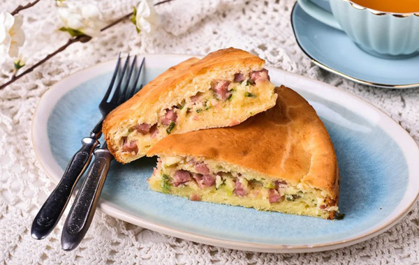 Заливной пирог с колбасой следует нарезать, когда он почти остынет (станет настолько теплым, что на нем можно спокойно будет удерживать ладонь). К этому времени текстура стабилизируется, и кусочки не будут разваливаться.