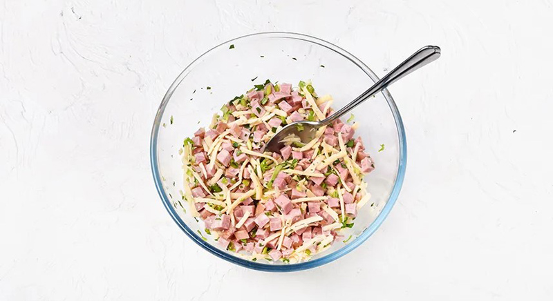 Подготовьте ингредиенты начинки. Нарежьте колбасу сначала кружочками толщиной 5–7 мм, затем кубиками. Сыр натрите на крупной терке. Измельчите зеленый лук и тонкие веточки петрушки с листочками.