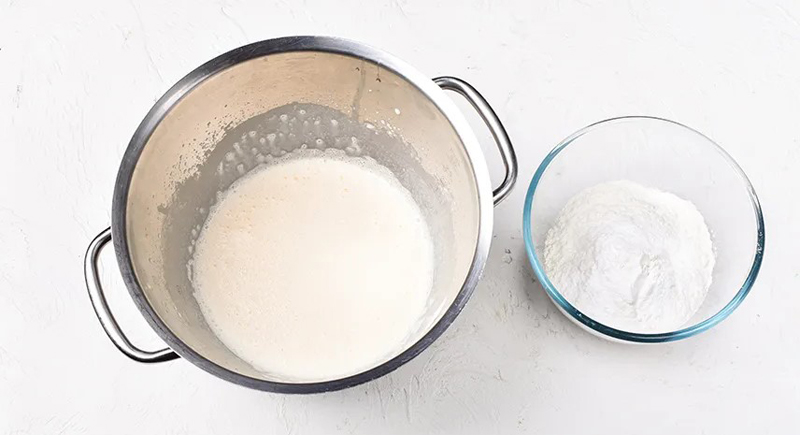 Сделайте тесто. Взбейте венчиком яйца с солью и сахаром. Добавьте сметану. Снова взбейте. Муку просейте через сито вместе с разрыхлителем: так он равномерно распределится по тесту.