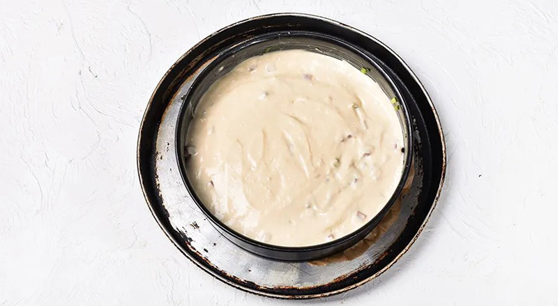 Соедините подготовленные ингредиенты начинки в миске и перемешайте. Оставьте до использования. Подготовьте форму диаметром 24 см. Ее можно застелить кулинарным пергаментом или просто смазать маслом (обязательно основательно промажьте стенки).