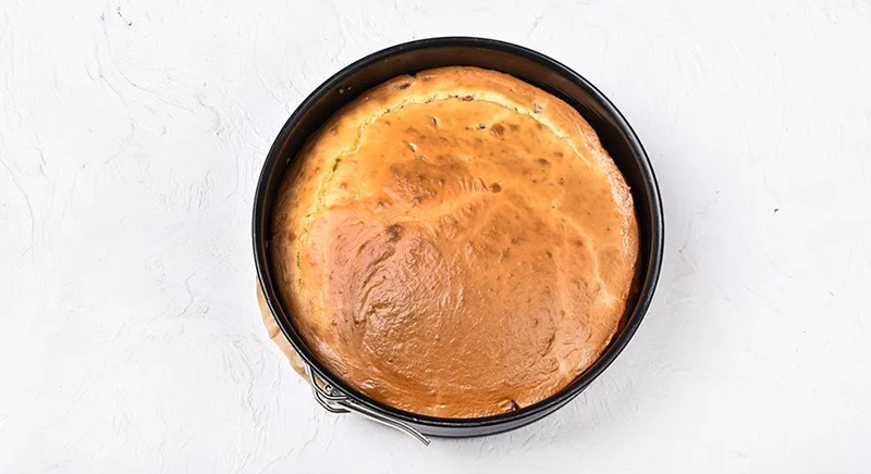 Залейте оставшимся тестом. Поставьте форму с ним на решетку, а ее — на средний уровень духовки. Выпекайте 30–35 минут. Дайте остыть пирогу минут десять, затем выложите на большую тарелку.