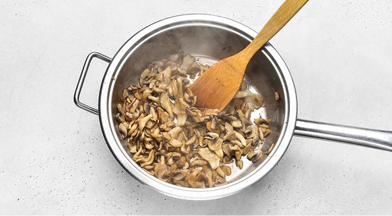 Возьмите две небольшие сковороды. Влейте в них по две столовые ложки масла. В одной слегка подрумяньте лук. В другой обжарьте вешенки и шампиньоны, часто перемешивая.