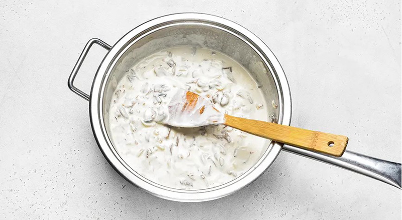 Лук выложите к грибам, перемешайте. Жарьте вместе около минуты. Добавьте сливки и сметану. Тушите на слабом огне около трех минут. Крышкой не накрывайте, иначе соус может расслоиться.