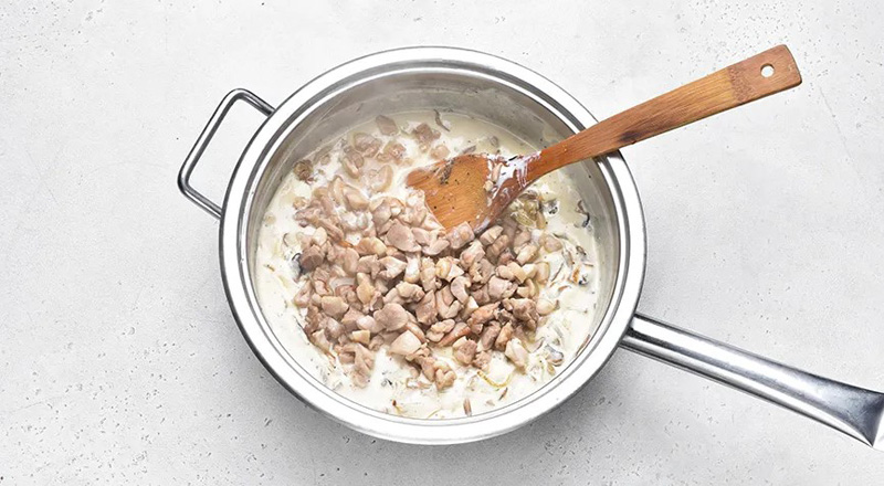 Переложите курицу к грибам со сливками и сметаной. Посолите, поперчите. Доведите до кипения. Разложите по небольшим формочкам. Посыпьте тертым сыром и быстро запеките в горячей духовке (210 °C) до румяной корочки.
