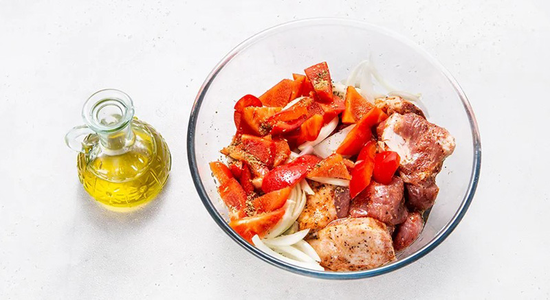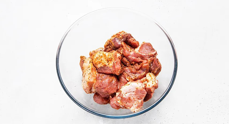Нарежьте свинину средними кусочками. Выложите в миску. Приправьте паприкой, луковым порошком, перцем чили, свежемолотым черным перцем по вкусу. Хорошо помассируйте мясо руками, чтобы специи равномерно покрыли все кусочки.