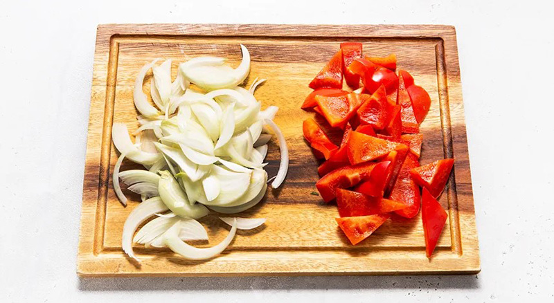 Очистите репчатый лук, нарежьте его толстыми перьями или дольками. Сладкий перец освободите от плодоножек и семян, нарежьте мякоть квадратными пластинками или соломкой.