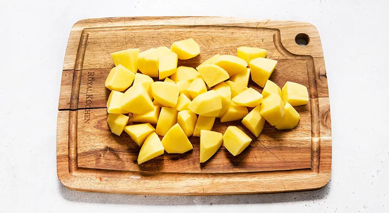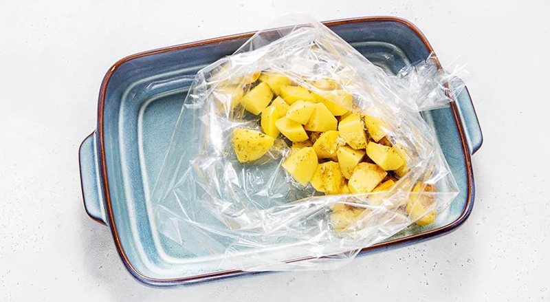 Вымойте и очистите картофель. Нарежьте его кусочками средней величины. Сразу подготовьте рукав для запекания. Закрепите один его конец. Поместите рукав в форму подходящего размера.
