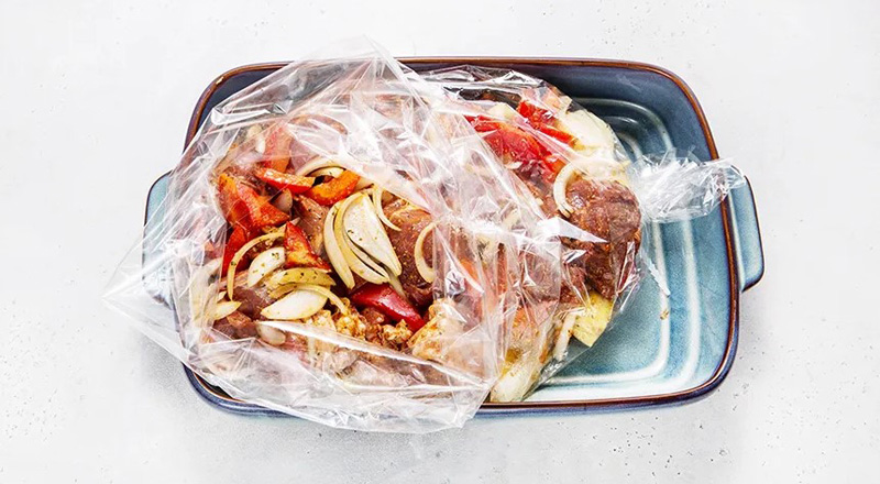 Многим не нравится, что при запекании в рукаве лук получается неаппетитным, «пареным». Но исключать его из ингредиентов было бы неправильно. Лук дает мясу сочность и отличный аромат. При добавлении в жаркое мы нарезали его крупно, чтобы «неженки» могли убрать его из готового блюда.