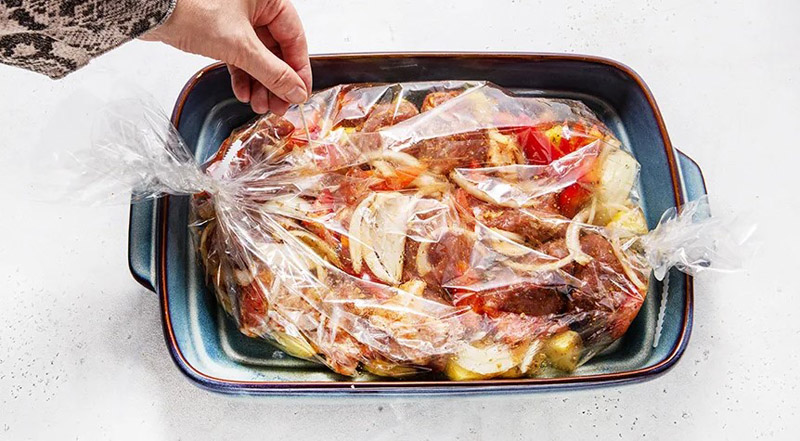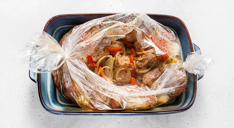 Запекайте жаркое из свинины с картошкой в рукаве в духовке около часа. Затем выньте форму и сделайте аккуратный разрез ножницами вдоль верхней части рукава.