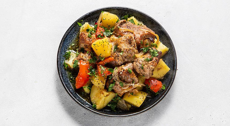 А для получения аппетитной корочки достаточно раскрыть пакет в последние 10–15 минут запекания. И, наконец, в-третьих, это прекрасная возможность сэкономить время и даже обеспечить обедом или ужином великовозрастное дитя, не поднаторевшее в кулинарии: мама может все подготовить и сложить в рукав, а ребенку придется только поставить форму с рукавом и его содержимым в духовку, а таймер на час. И все получится идеально. Мы приготовим в рукаве самый ходовой вариант жаркого — из свинины с картошкой и овощами. Вы можете добавлять в рецептуру другие ингредиенты по своему желанию — морковь, кабачки, баклажаны, а свинину заменить на курицу или индейку. Главное — руководствоваться общими принципами.