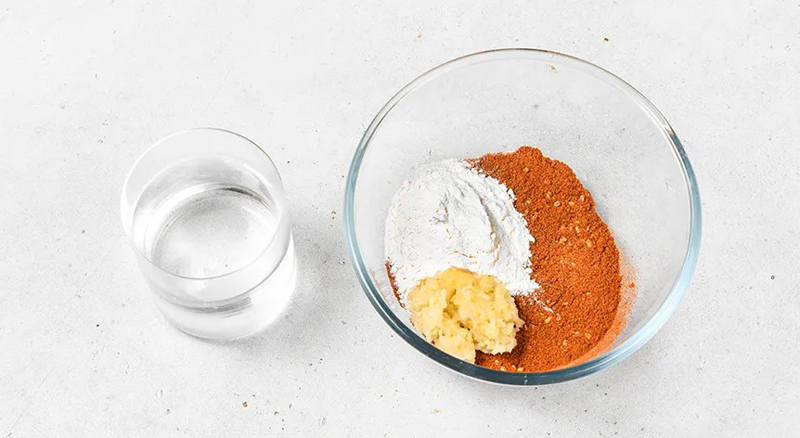 Прогрейте смесь специй на сухой сковороде, помешивая, 3 минуты. Пересыпьте в глубокую миску. Добавьте чеснок и похинд (можно заменить на обычную пшеничную муку). Перемешайте до однородности, затем постепенно влейте 250 мл холодной воды. У вас должна получиться кашица.