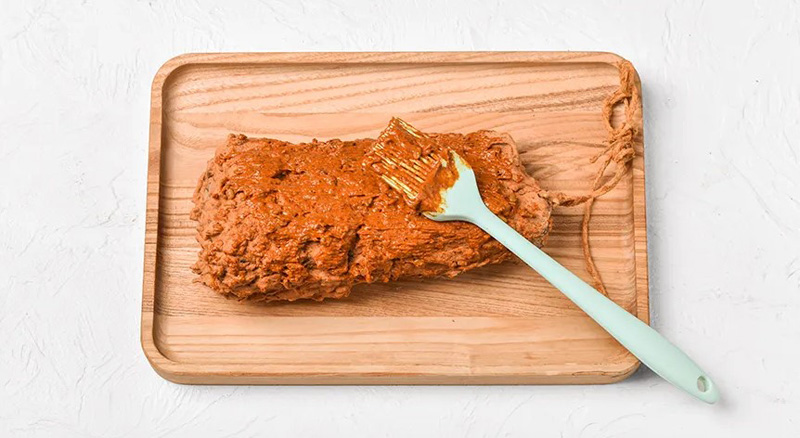 Смажьте говядину со всех сторон толстым слоем ароматной обмазки. Следите, чтобы не оставалось никаких пустот — мясо должно быть как в коконе. При этом у вас еще останется довольно много обмазки — так и должно быть. Переложите ее в герметично закрывающийся контейнер и уберите в холодильник.