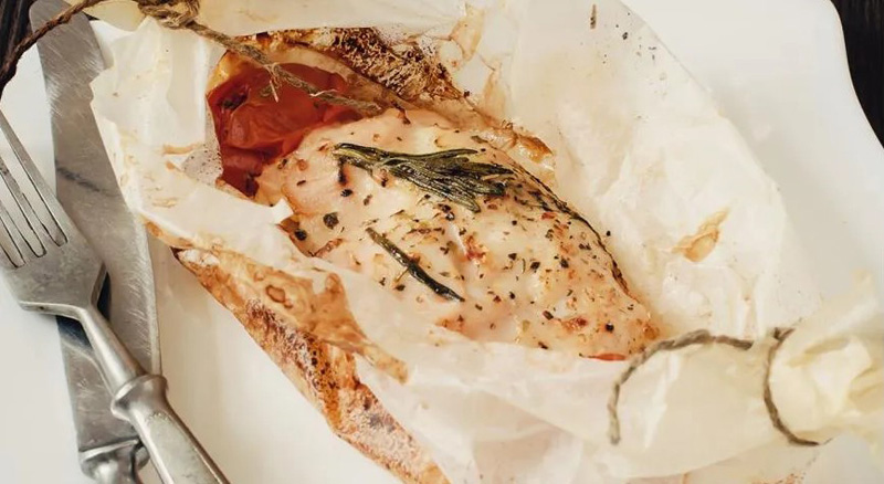 Завернуть пергамент, как конфету, завязав края шпагатом. Уложить в форму и запекать 30 минут Затем пергамент раскрыть и готовить еще 10 минут до румяной корочки.