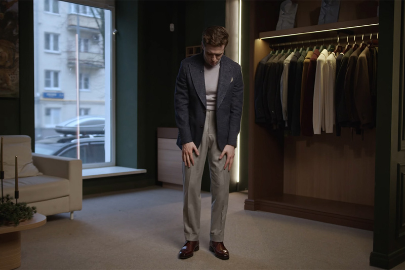 Третий образ — уже классический smart casual из отдельных брюк и пиджака. В коллекции представлено огромное количество цветов: оттенки коричневого, рыжего, темно-синего, графитового, четыре оттенка серого, два зеленого.