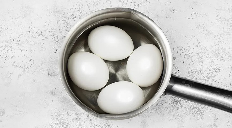 Сварите куриные яйца вкрутую без особых ухищрений, в течение 9–10 минут. Даже если они лопнут — ничего страшного. Переложите яйца в холодную воду, дайте им остыть.