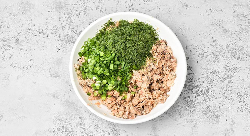 Зеленый лук вымойте и обсушите салфетками. Так же поступите с укропом. Лук мелко нашинкуйте вместе с белыми частями. У укропа нарежьте только лиственную часть без стебельков. Добавьте весь лук и половину укропа в миску к рыбе.