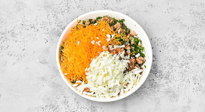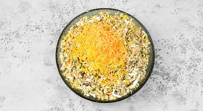 Полутвердый сыр натрите на мелкой терке, положите в миску к остальным ингредиентам. Очистите остывшие яйца, разделите на белки и желтки. Натрите белки на крупной терке в миску со всем остальным.