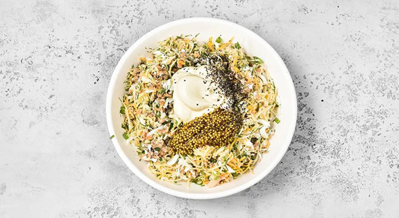 Смешайте майонез с зернистой горчицей и небольшим количеством сока из-под горбуши. Добавьте получившийся соус в салат, хорошо перемешайте, приправьте свежемолотым черным перцем по вкусу.