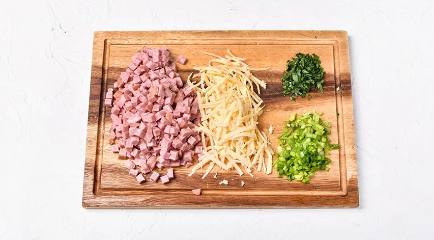 Подготовьте ингредиенты начинки. Нарежьте колбасу сначала кружочками толщиной 5–7 мм, затем кубиками. Сыр натрите на крупной терке. Измельчите зеленый лук и тонкие веточки петрушки с листочками.
