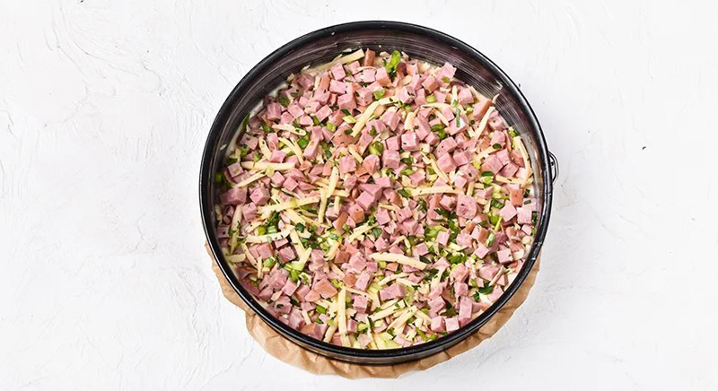 Соедините подготовленные ингредиенты начинки в миске и перемешайте. Оставьте до использования. Подготовьте форму диаметром 24 см. Ее можно застелить кулинарным пергаментом или просто смазать маслом (обязательно основательно промажьте стенки).